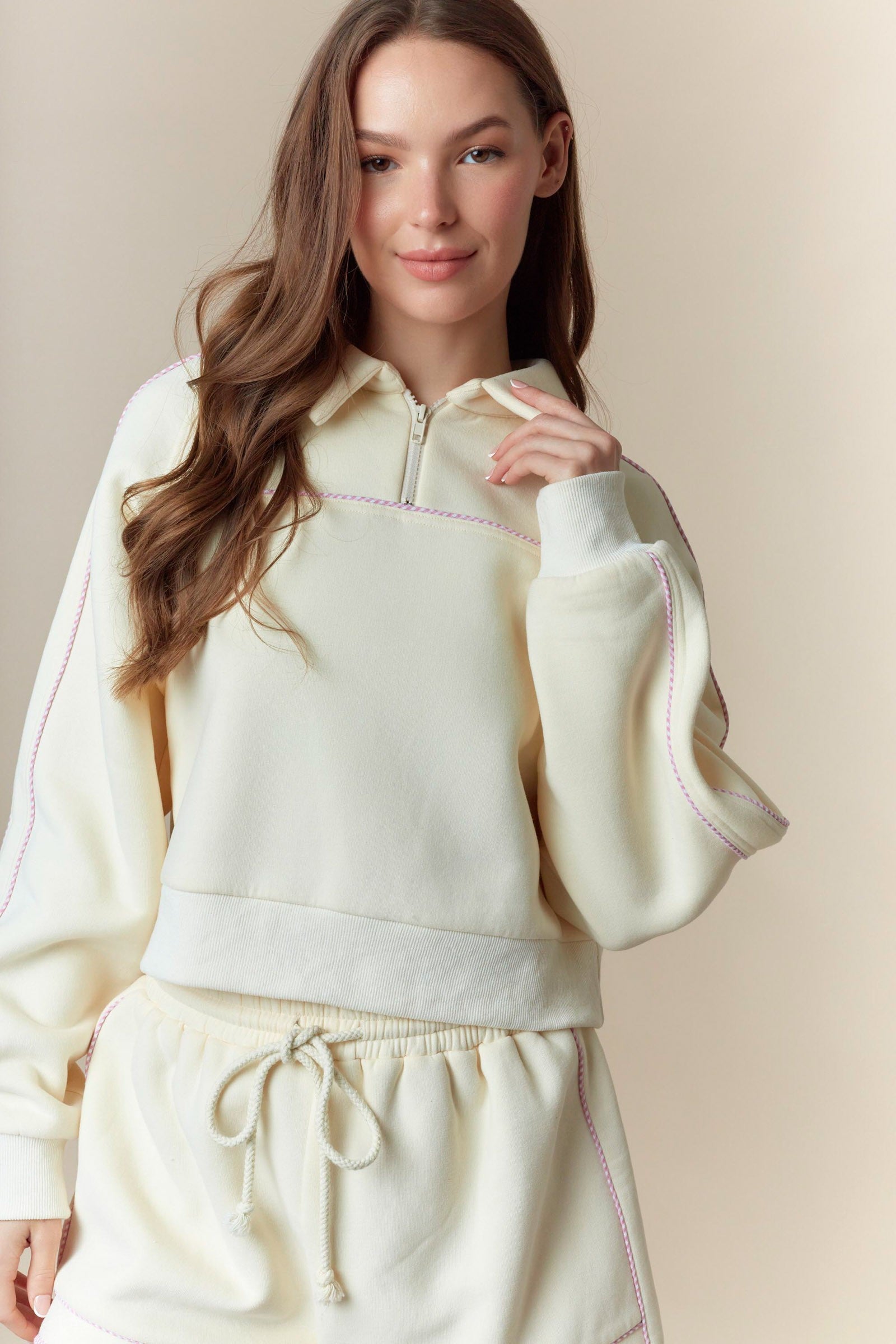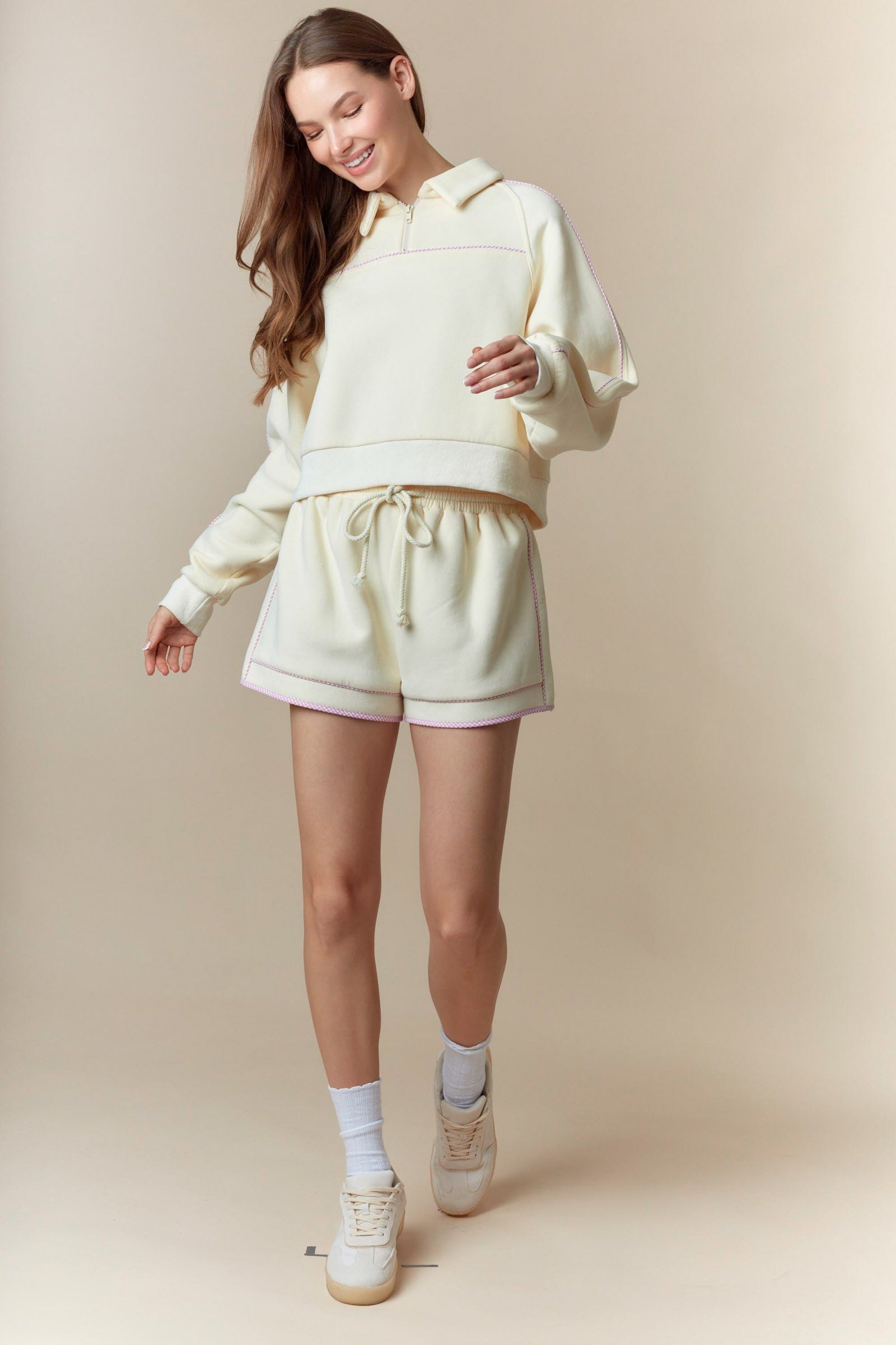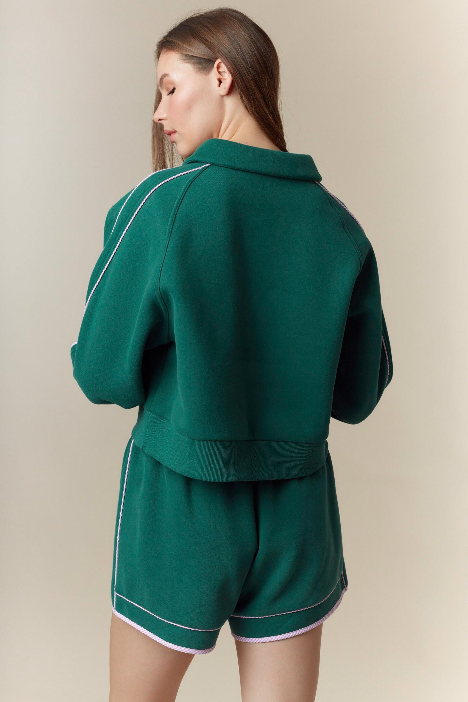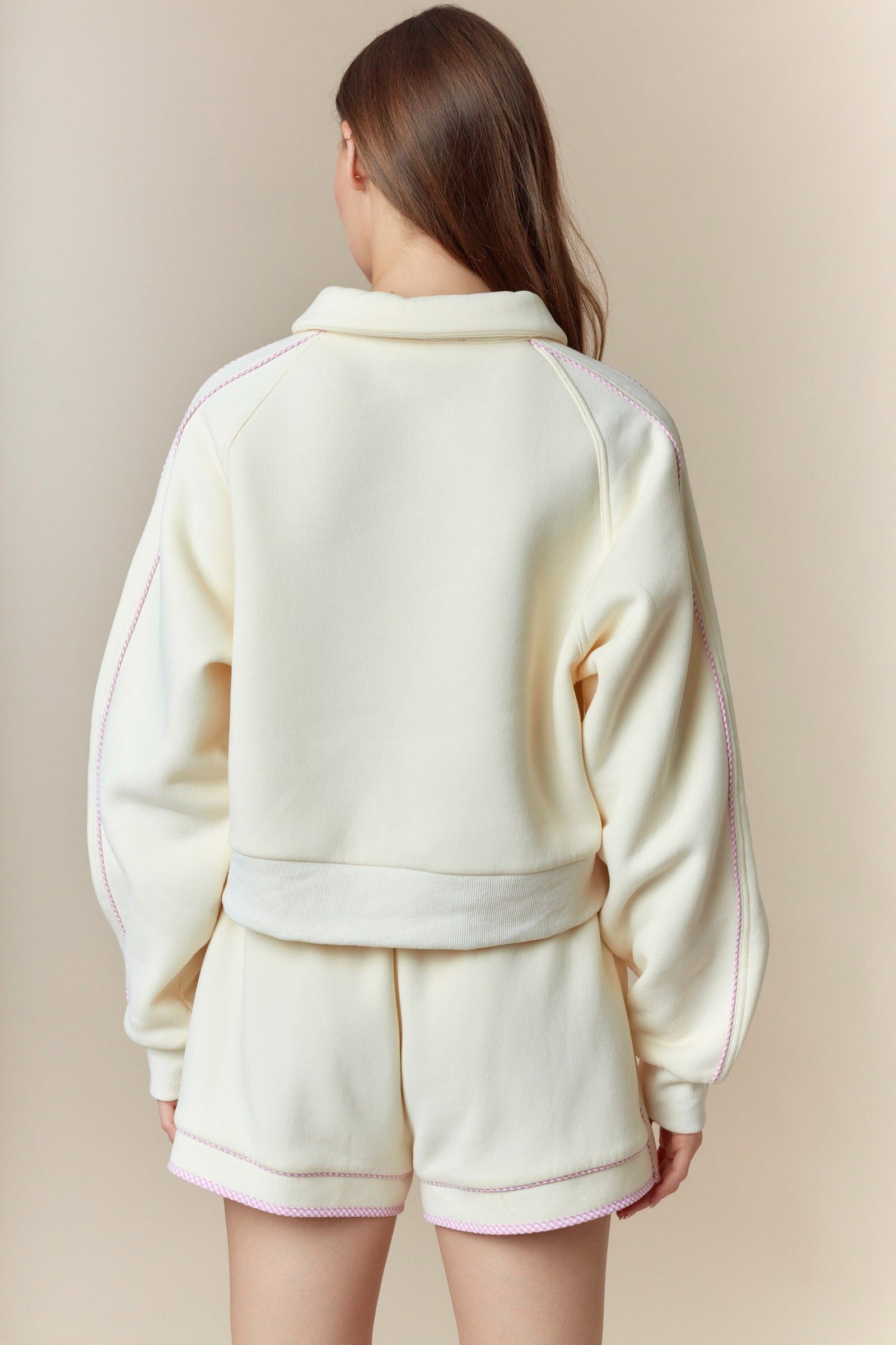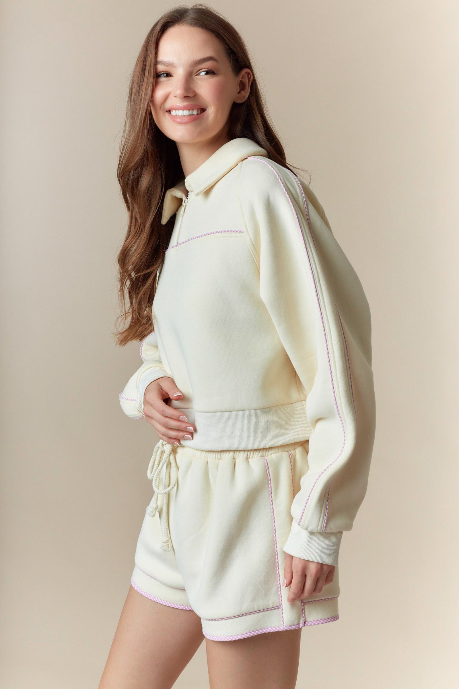 Elevate your comfort game with this charming gingham piping detailed fleece French terry sweatshirt and shorts set. The thoughtfully designed piping adds a touch of preppy sophistication, while the soft fleece fabric keeps you cozy all day long. Perfect for lounging, running errands, or casual hangouts, this versatile set transitions seamlessly from day to night. Available in three stunning colorways—cream, pink, and green with pink accents—you'll find the perfect shade to match your personal style. Invest in a set that combines comfort, quality, and effortless style.